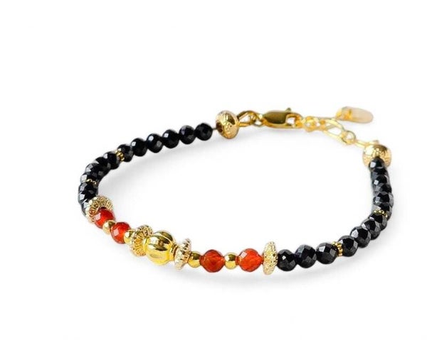 Composition : Onyx noir, breloques en laiton doré 18 & 24 carats.