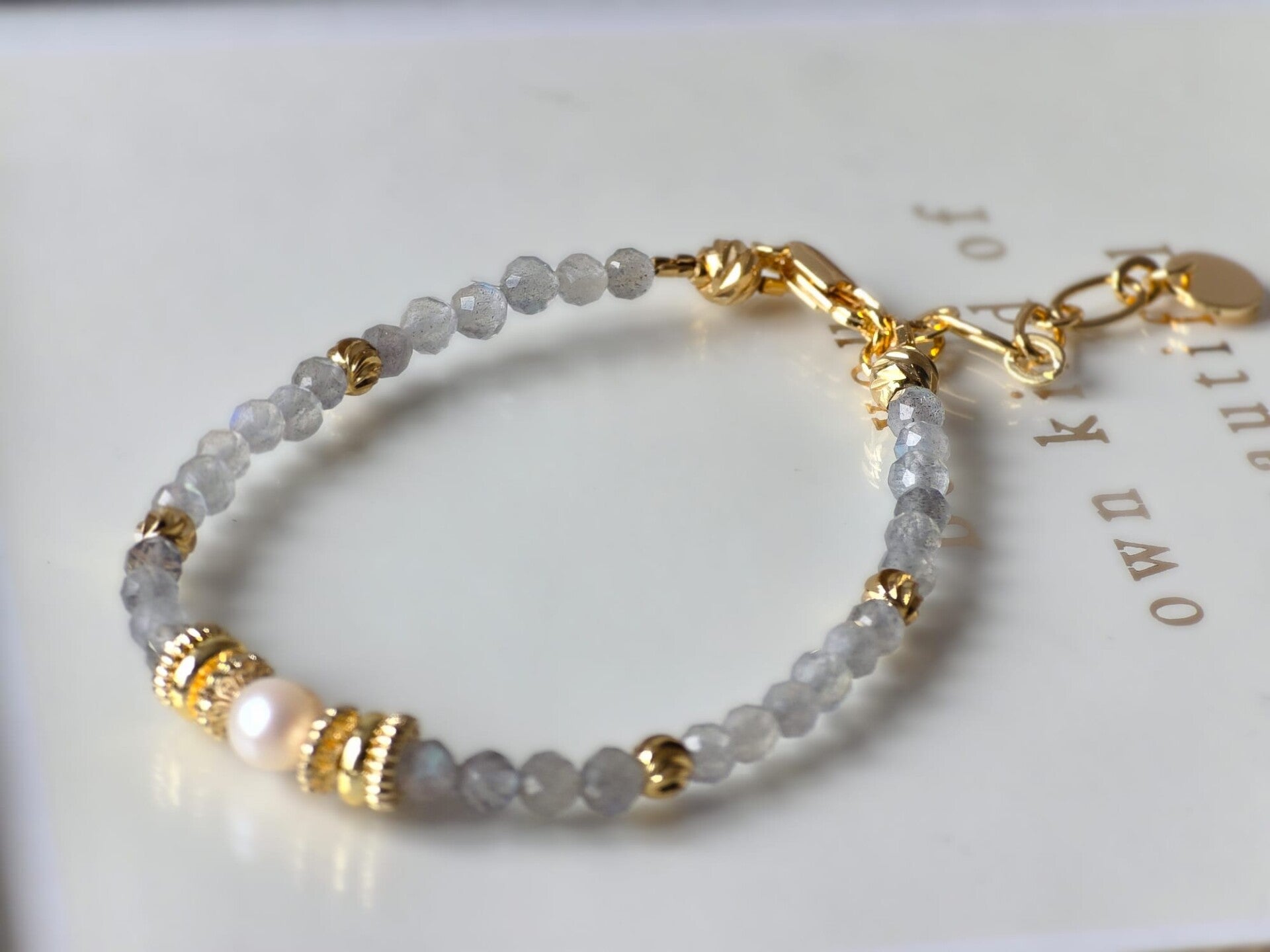 Détails techniques : Montage artisanal réalisé avec soin sur fil résistant. Fermoir & chaînette de rallonge en laiton doré 18 carats.