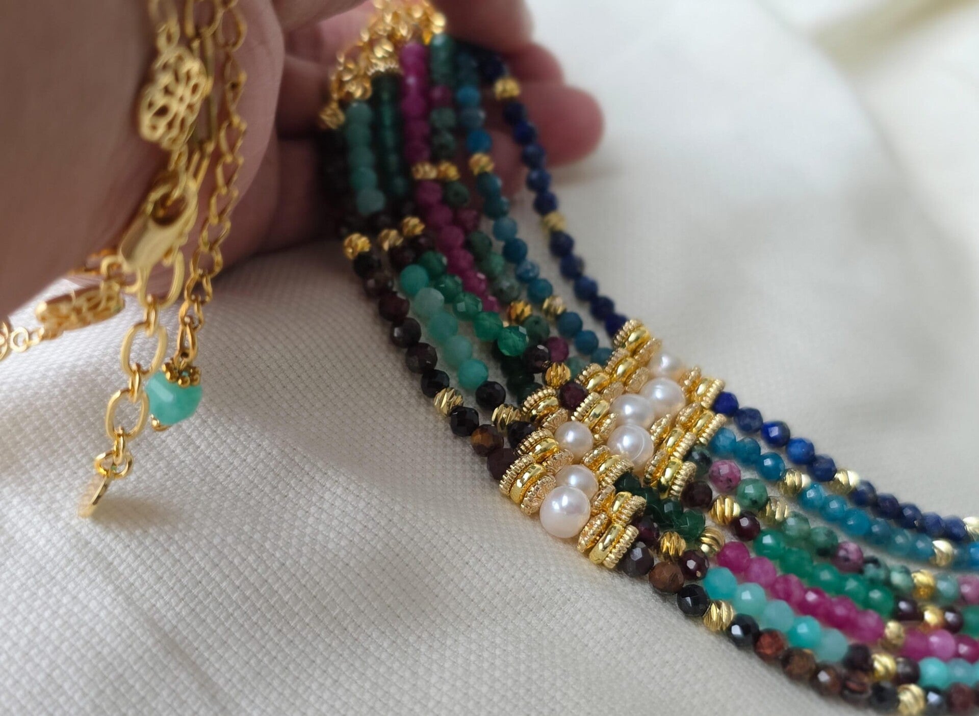 Composition: Pierres naturelles, perles naturel d'eau douce, breloques en laiton doré 18 carats.