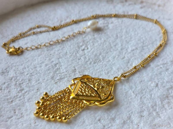 Composition : Chaîne en acier inoxydable, pampilles et pendentif en laiton doré 24k, perle d'eau douce.
