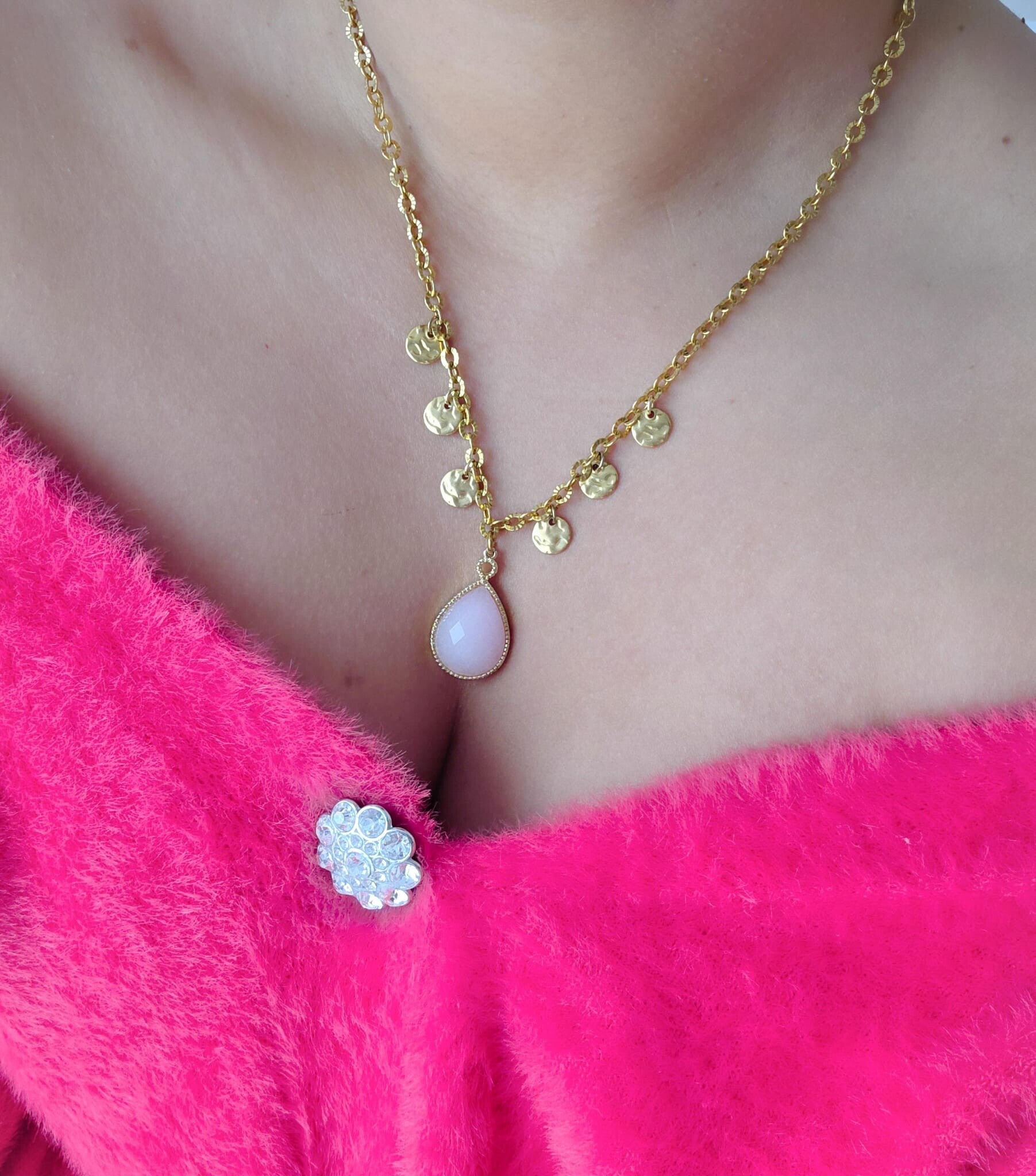 - Composition : Jade Rose, chaîne en acier inoxydable.
